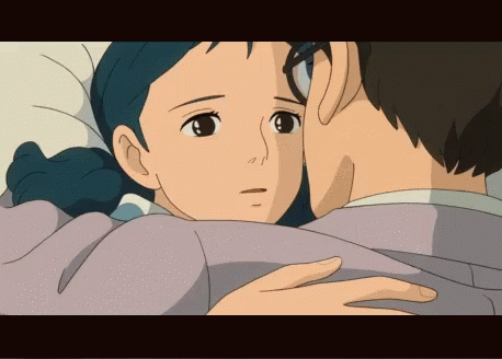 A tender moment from Vidas Ao Vento (Kaze Tachinu) where a young woman is comforted with a hug, showing deep emotion.