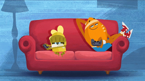 Opa and Hector relax on a red couch, engrossed in a video game session with their controllers.