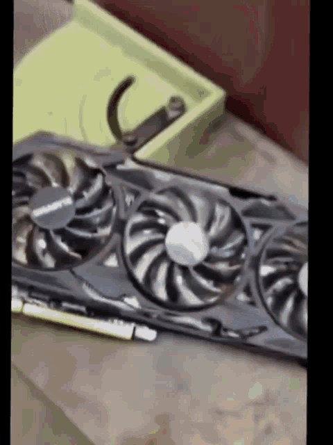 A person wearing red gloves uses a sanding machine to modify a Gigabyte graphics card.