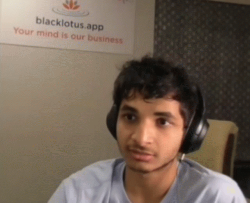 Vidit Gujrathi, wearing headphones, says 'Mujhe Nahi Pata' (I don't know) in front of a blacklotus.app sign.