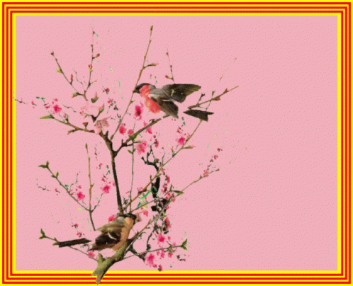 Vietnamese New Year greeting card for 2019 featuring two birds on a blossoming branch.