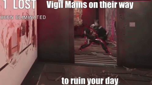 A meme featuring a character from Rainbow Six Siege, Vigil, with text indicating 'Vigil Mains on their way to ruin your day'.