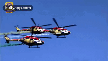 Indian Air Force helicopters perform the impressive Vijay Formation aerobatics, leaving colorful smoke trails.