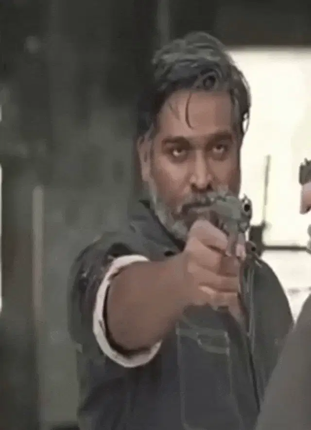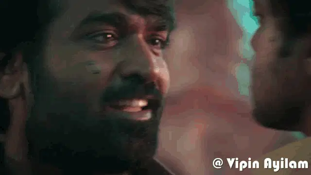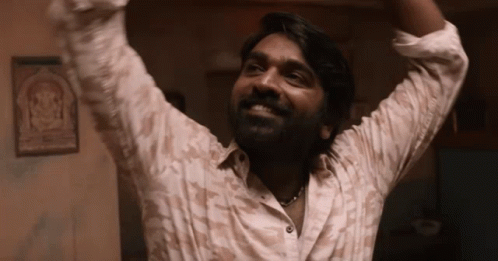 Vijay Sethupathi smiling and stretching his arms up, looking happy and relaxed in a casual setting.