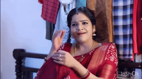 Chithu from Vijaytv, wearing a red saree, smiles happily while sitting on a bed, with 'AATHI' on screen.