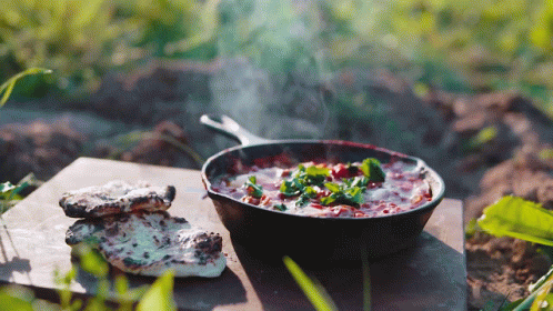 Viking The Chef Vtc prepares a steaming pan of food with fresh herbs and flatbreads outdoors.