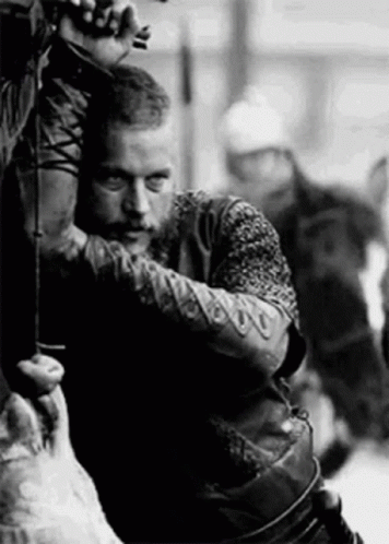 Travis Fimmel as Ragnar Lothbrok, intensely portrayed in a black and white scene from the series Vikings.