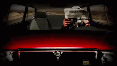 Vilebrequin Enzo reading 'The New York Times' newspaper while driving a car, captured from the front.