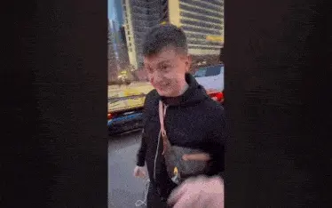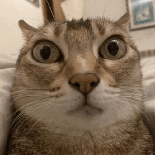 A close-up of a tabby cat with wide, surprised eyes, featuring meme-like visual effects.