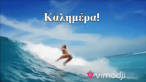 Woman surfing a wave with 'Good morning!' text and Vimodji logo.