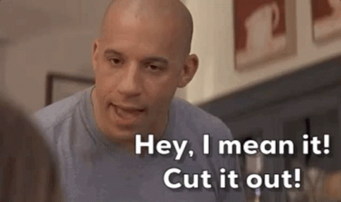 Vin Diesel from The Pacifier sternly tells someone to 'Cut it out!' with an annoyed expression.