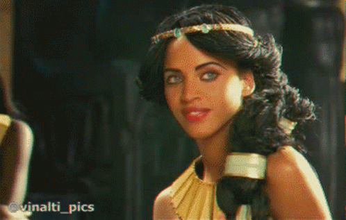 Vinalti Asterix, a woman in ancient attire with a jeweled headband and braided hair, smiles and waves.