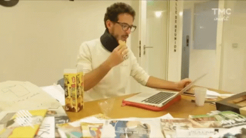 Vincent Dedienne, wearing a neck brace, sits at a desk with a laptop and a TMC juice box during Quotidien.
