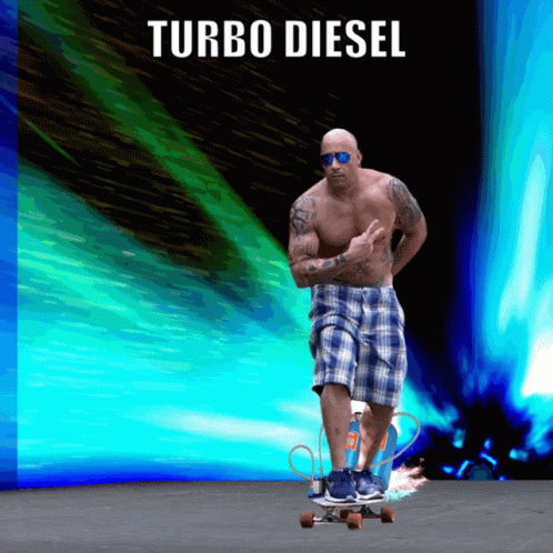 Vin Diesel rides a turbo-powered skateboard, emitting flames and speed, embodying the Fast and Furious spirit.