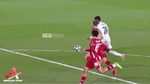 Vinicius Jr dribbles the ball during a soccer match, surrounded by opposing players on the field.