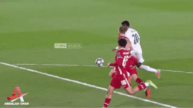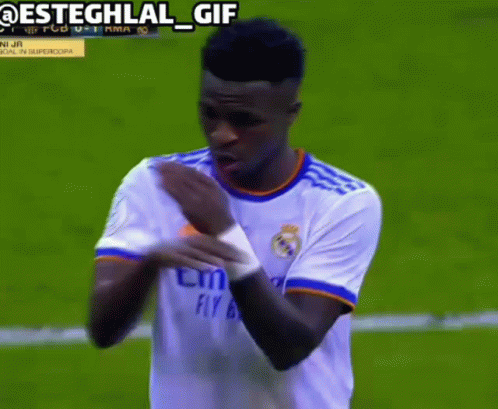Vinicius Jr, wearing his Real Madrid jersey, reacts on the football field during a match.