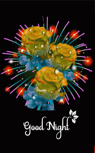 Good Night greeting with vibrant roses, sparkling fireworks, and a personal touch from Nasiii, titled 'Violeta'.