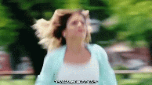 Martina Stoessel as Violetta running outdoors, chasing a picture of León.