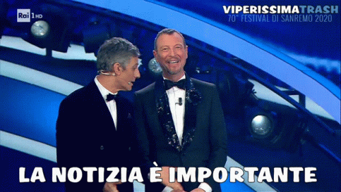 Amadeus on stage at Sanremo 2020, with the caption 'La Notizia È Importante' (The News Is Important).