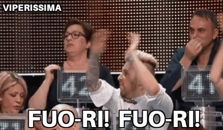 People on a game show panel passionately shout 'Fuori! Fuori!' during a segment of Viperissima.