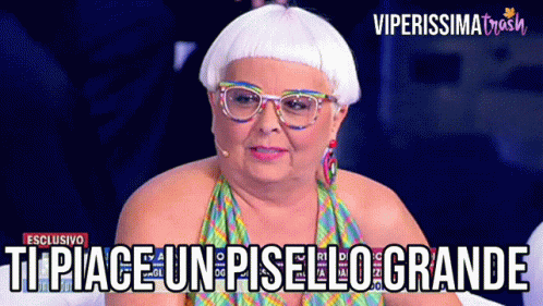 A woman with a white wig and colorful glasses asks 'Do you like a big penis?' on Viperissima Live.