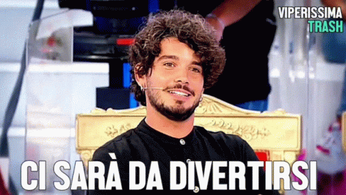 Man with curly hair and beard smiles, with the Italian caption 'Ci sarĂ da divertirsi' (There will be fun).
