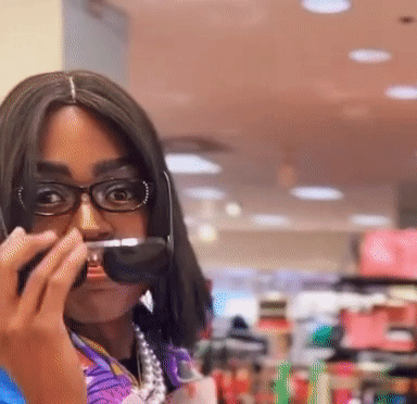 Viralwigs woman posing for a picture, wearing glasses and a colorful scarf in a store setting.
