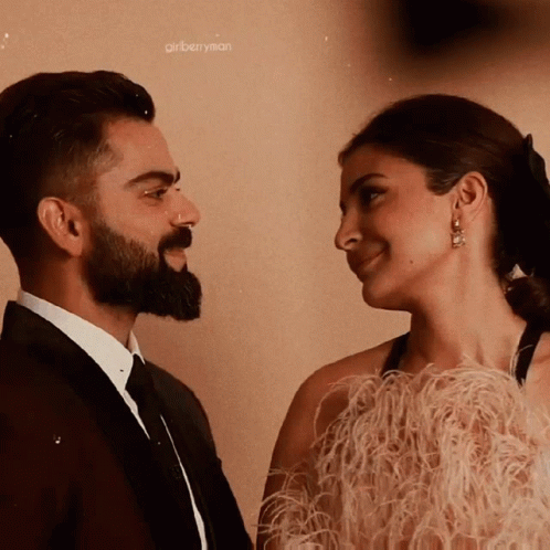 Virat Kohli and Anushka Sharma share a loving gaze, smiling at each other in a warm, affectionate moment.