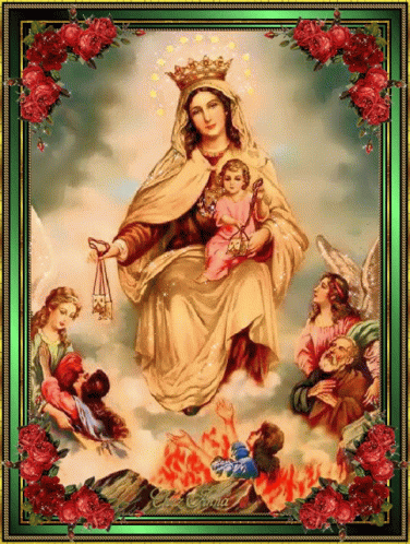A classic painting depicting the Virgin Mary holding the infant Jesus, framed in green.