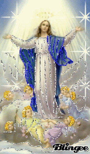 Animated image of the Virgin Mary surrounded by sparkling angels, featuring the Blingee aesthetic.