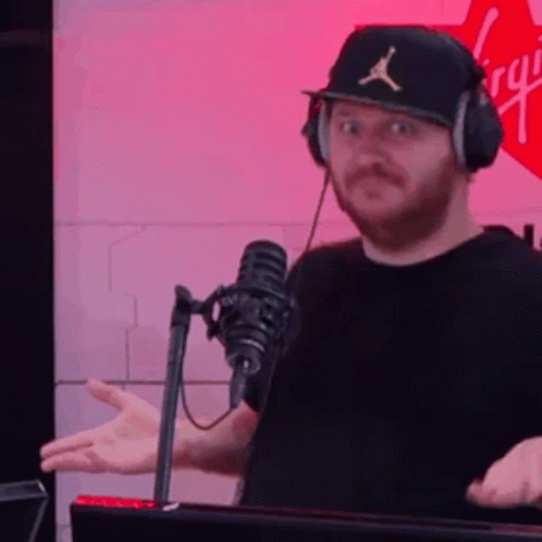 Clemlincruste, a radio host, makes funny expressions and gestures in the Virgin Radio studio.