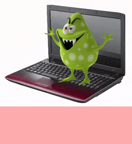 A green monster warns of a Malvare virus infection on a laptop, demanding 15000 rubles within 24 hours.