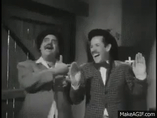 Viruta and Capulina share a moment of uncontrollable laughter, with Viruta clapping and Capulina throwing his hands up.