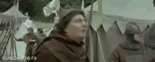 A man in a hooded robe looks up, exclaiming 'Thank God!' in a scene from Les Visiteurs.