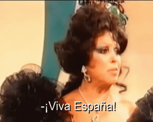 A woman with a dramatic hairstyle and makeup passionately exclaims '¡Viva España!' in this memorable clip.