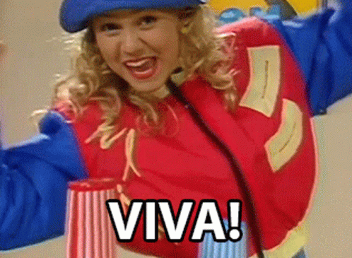 Angelica from Bom Dia E Cia, full of energy and excitement, exclaims 'VIVA!' with a big smile.