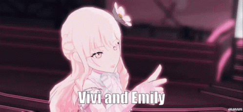 Vivi and Emily, two anime girls from Project Sekai, dancing in a vibrant pink setting.