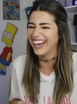 Vivian Amorim bursts into laughter, with a Bart Simpson poster visible in the background.