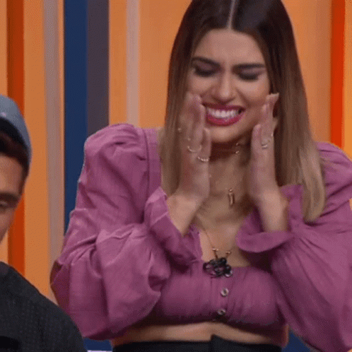 Vivian Amorim reacts with shock and surprise, covering her mouth in a purple top.