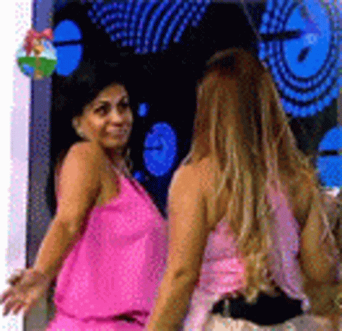 Viviane Araújo and Gretchen dancing together in pink tops, vibing to the music.