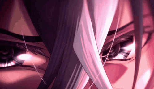 Vivy from Vivy: Fluorite Eye's Song with intense, glowing pink and purple anime eyes.