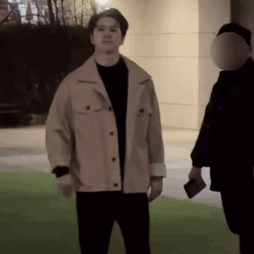 VIXX's Ken (Lee Jaehwan) performs a dramatic and fancy bow, waving to fans while wearing a tan jacket.