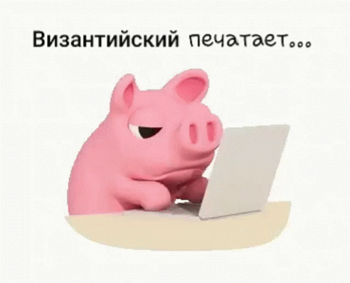 Pink pig 'Byzantine' intently typing on a laptop, with a focused and slightly annoyed expression.