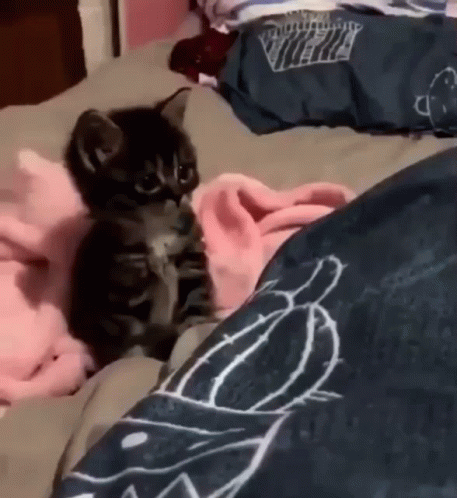 An adorable, tiny tabby kitten sits upright on a soft bed, looking around with wide, curious eyes.