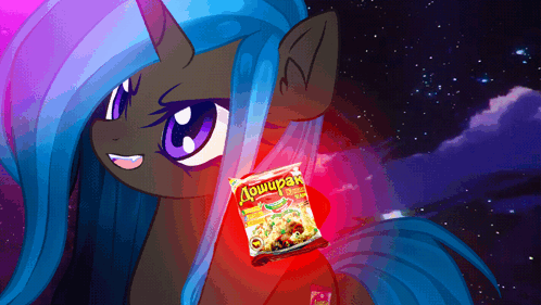 Vledushka, a cartoon unicorn pony, smiles as a glowing Doshirak instant noodle packet floats before her in space.