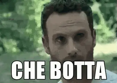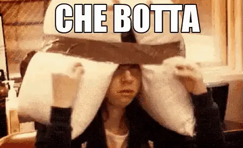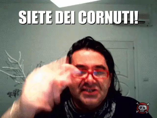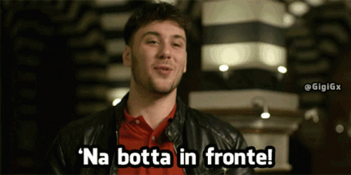 A man in a black jacket says 'Na botta in fronte! (A hit to the forehead!) with a hand gesture.