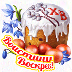 An Easter greeting card featuring a traditional kulich cake, painted eggs, and the phrase "Truly He is Risen!".
