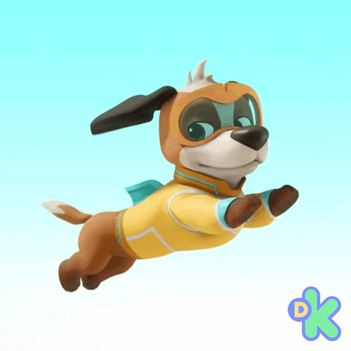 Animated superhero dog from Campamento Smash flying through a clear blue sky in a yellow suit and goggles.