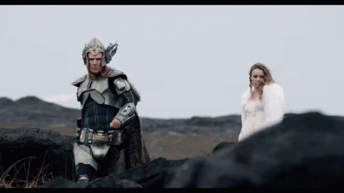 Volcano Man in armor and a woman in a white fur coat walk through a desolate, rocky volcanic landscape.