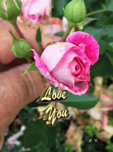 A beautiful pink and white rosebud held by a hand, featuring a 'Love You' text overlay.
